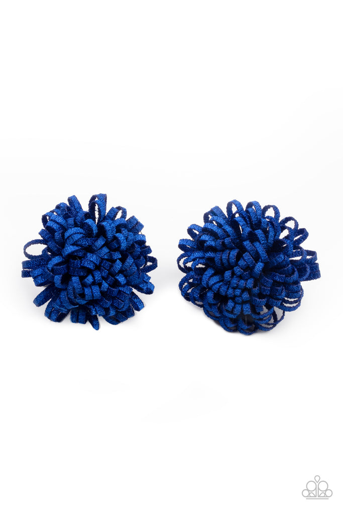 Shimmery blue ribbon curls into a pair of bouncy blossoms for a colorful springtime look. Each flower features a standard hair clip on the back.
