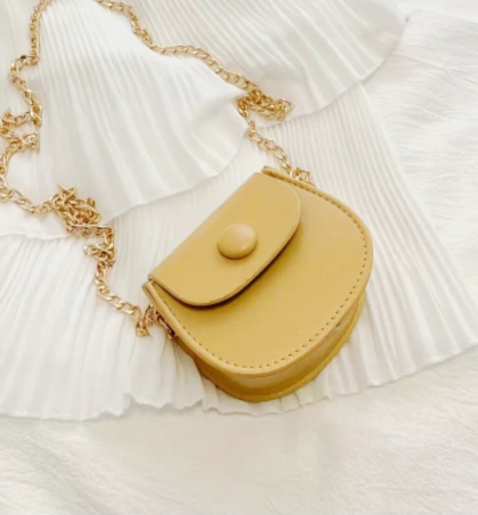 This faux leather coin purse has a magnetic button closure and a gold cross body length chain. It is the perfect accessory for keeping your essentials organized and secure on-the-go. Its small size makes it convenient to carry, while the yellow color adds a touch of elegance. Stay stylishly organized with Just A Little Something Purse. Available in multiple colors.
