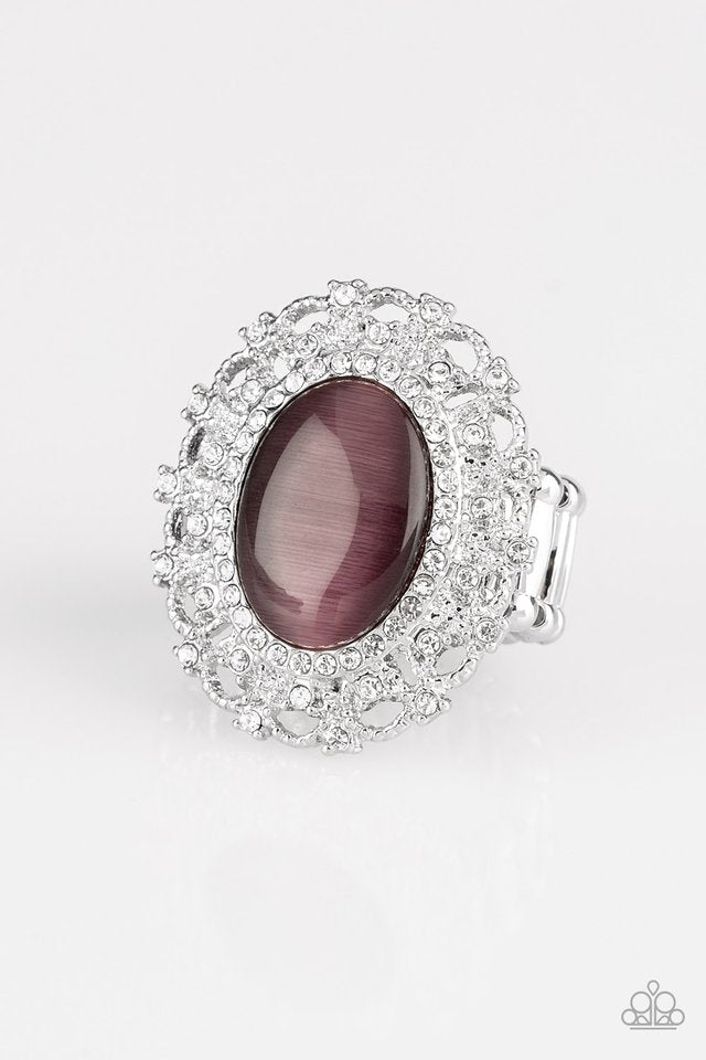 Encrusted in dainty white rhinestones, a frilly silver frame spins around a glowing purple moonstone center for a regal look. Features a stretchy band for a flexible fit.