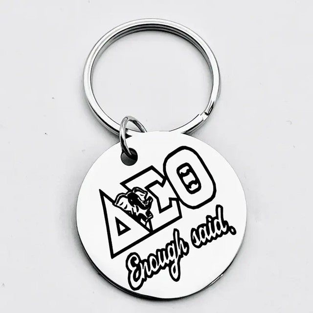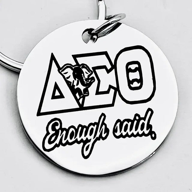 Crafted from high-quality stainless steel, this round Delta Sigma Theta keychain showcases the bold phrase "ENOUGH SAID." Show off your pride for your sorority with this durable and stylish accessory. With its sleek design and expert construction, this keychain is a must-have for any Delta Sigma Theta member.