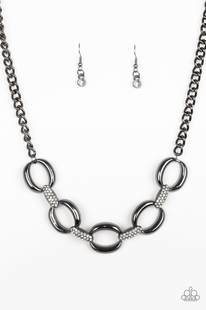 Bold gunmetal links join with white rhinestone encrusted frames below the collar for a fierce look. Features an adjustable clasp closure.